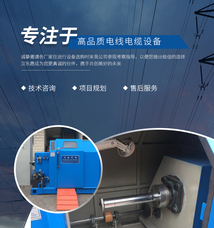 常州漢東機(jī)械始創(chuàng)于2006年,是集電線電纜機(jī)械設(shè)計、開發(fā)、制造、安裝、調(diào)試為一體化的高科技企業(yè)。本公司自開業(yè)以來,積極引進(jìn)日本,歐美等國外電線電纜設(shè)備之先進(jìn)技術(shù),先后成功推出了達(dá)到行業(yè)先進(jìn)水平的電線電纜設(shè)備,主要產(chǎn)品有擠出、繞包、束線、成纜等電線電纜固定設(shè)備。在提供系統(tǒng)設(shè)備的同時,還向客戶提供售前技術(shù)咨詢、項(xiàng)目規(guī)劃、以及售后服務(wù)。我公司本著“以人為本、科技先導(dǎo)、用戶為上”的宗旨,為客戶提供牢靠的產(chǎn)品與省心的服務(wù)。漢東愿成為您更真誠的伙伴,攜手共創(chuàng)美好的未來!